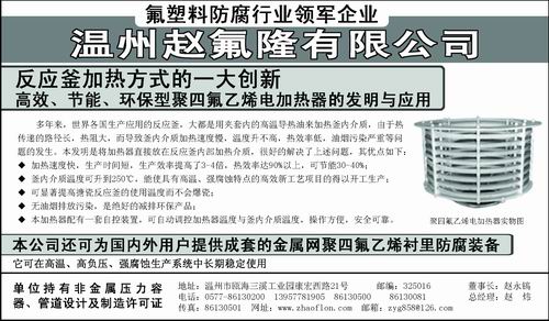 温州赵氟隆有限公司 版权所有 浙ICP备12044633号 电话:0577-86130500 传真:0577-86130501 邮箱:info@zhaoflon.com (国内业务) biz@zhaoflon.com (国际业务) 地址:浙江省温州市瓯海三溪工业园康宏西路21号 邮编:325016 网址:http://www.zhaoflon.com.cn