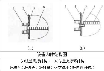 (2)设备内的内件如栅板等应设计成法兰连接结构或法兰夹持结构,如下图所示。设备内部的加热管、搅拌浆等应在衬里施工后安装,其最大外径与衬里面距离应大于100mm。如下图所示。